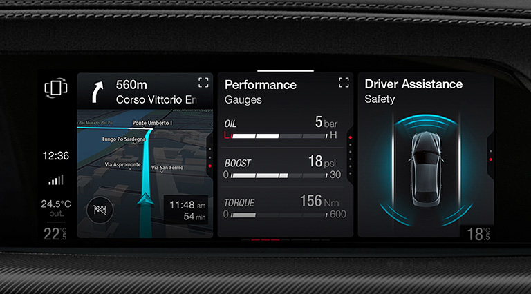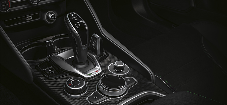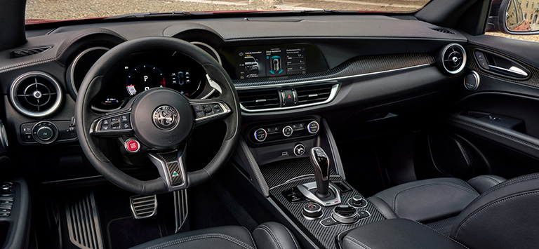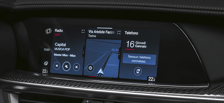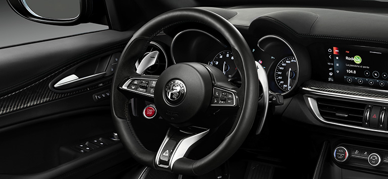 מערכת המידע והבידור של Alfa Romeo Stelvio Quadrifoglio כוללת מסך Multi-Touch אינטרקטיבי בגודל 8.8 אינץ'.