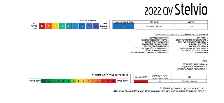 צריכת דלק Stelvio Quadrifoglio Range (l/100 ק"מ): 11,8; פליטת CO2 (גרם/ק"מ): 267.ערכי אישור סוג שנקבעו על בסיס מחזור משולב WLTP, עודכנו בתאריך-26.05.2021. הערכים המצוינים הינם למטרות השוואה בלבד.